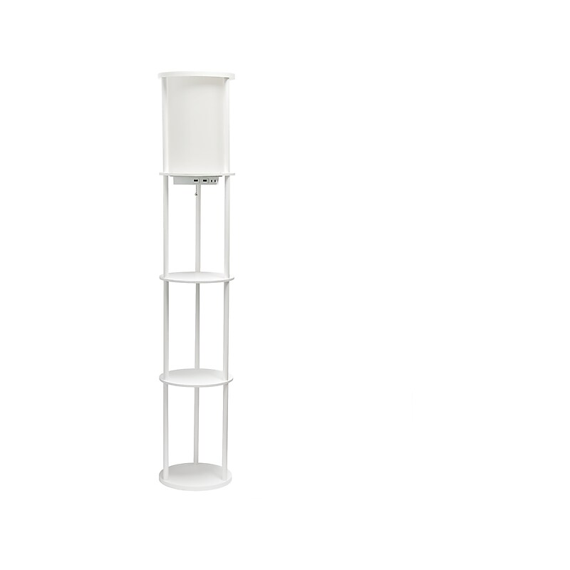 Elevate your living space with this stylish yet functional three-shelf floor lamp by Simple Designs. Illuminate your room, showcase your favorite decor, and charge your essential electronic devices at the same time. This gorgeous piece adds versatility as the shelves can be used to display photographs and other memorabilia, while the linen lampshade casts a soft, warming light throughout your living space. This lamp adds sophistication and style to any home's decor. Check out all of the available base finish color options available to suit your needs. Modern etagere floor lamp adds sophistication and style to any home decor. Uses a 100W equivalent A19 E26 medium-base bulb (not included). Overall dimensions: 62. 5"H x 11. 5"Dia. Made of MDF and metal and comes in afinish that works well with all decor. Beautiful linen cylindricalshade complements the soft curves. Comes with a 9. 5'power cord. Stay organized while showcasing your favorite pictures, books, or candles on the three built-in shelves. White shade casts a soft, charming glow illuminating your favorite books or pictures displayed on the shelves. Equipped with two output 5V/2A USB ports and one outlet, making it perfect for charging all of your electronic devices in one spot. Convenient on/off pull-chain switch is located directly under the shade for easy access. Assembly is required (Phillips head screwdriver is required but not included; instruction manual is included). 1-year manufacturer limited warranty.