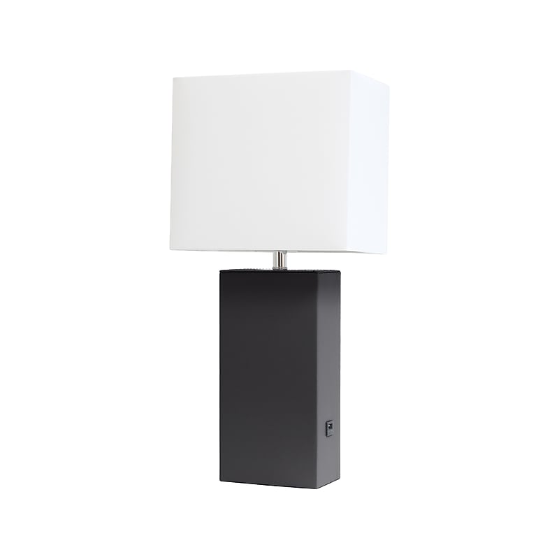The perfectly constructed Lalia Home Lexington table lamp is designed to sit in just about any space, with a base color of your choice, and is equipped with a USB port for functionality beyond decor. The sturdy yet lightweight base is wrapped in faux leather and sits beneath a crisp white fabric shade to ensure sophistication is met on your updated lighting decor. Modern table lamp designed to sit in just about any space. Requires a 60W equivalent A19 medium-base bulb (not included). Overall dimensions: 21"H x 10"W x 6"D; shade measures 9"H x 10"W x 6"D. Features a rectangular white fabric shade for a clean, fresh look and a rectangular faux leather wrapped base Comes with a 6' black plug-in cord. Equipped with a USB port for convenient charging of electronic devices, including phones, tablets, handheld games, headphones, smartwatches, and more. Pushpin switch on the socket for easy accessibility. Lamp shade is secured using an uno ring. 1-year manufacturer limited warranty.