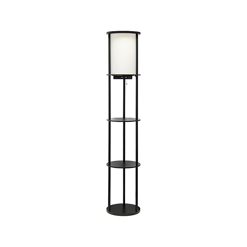Elevate your living space with this stylish yet functional three-shelf floor lamp by Simple Designs. Illuminate your room, showcase your favorite decor, and charge your essential electronic devices at the same time. This gorgeous piece adds versatility as the shelves can be used to display photographs and other memorabilia, while the linen lampshade casts a soft, warming light throughout your living space. This lamp adds sophistication and style to any home's decor. Check out all of the available base finish color options available to suit your needs. Modern etagere floor lamp adds sophistication and style to any home decor. Uses a 100W equivalent A19 E26 medium-base bulb (not included). Overall dimensions: 62. 5"H x 11. 5"Dia. Made of MDF and metal and comes in afinish that works well with all decor. Beautiful linen cylindrical white shade complements the soft curves. Comes with a 9. 5'power cord. Stay organized while showcasing your favorite pictures, books, or candles on the three built-in shelves. White shade casts a soft, charming glow illuminating your favorite books or pictures displayed on the shelves. Equipped with two output 5V/2A USB ports and one outlet, making it perfect for charging all of your electronic devices in one spot. Convenient on/off pull-chain switch is located directly under the shade for easy access. Assembly is required (Phillips head screwdriver is required but not included; instruction manual is included). 1-year manufacturer limited warranty.
