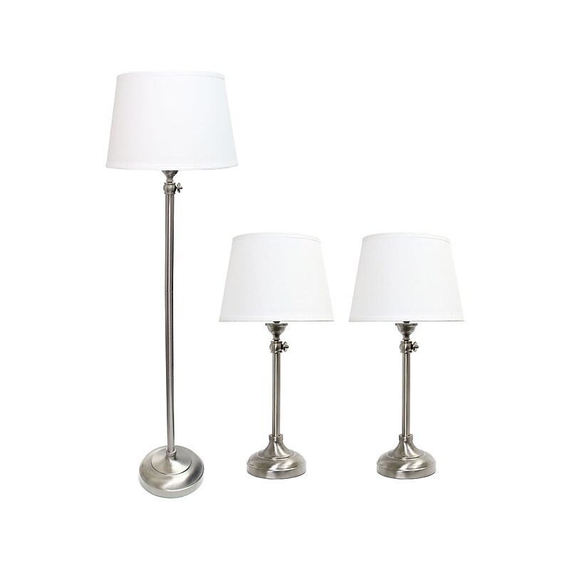 Upgrade your home with this Lalia Home Perennial beautiful three-piece matching table and floor lamp set. Afinish graciously embraces the sleek base of each lamp, and is paired with a lovely white fabric shade to bring you a sophisticated decor style while satisfying your lighting needs. Perfect for modern, traditional, and contemporary spaces. Upgrade your home with this beautiful three-piece matching table and floor lamp set. Each lamp requires a 100W equivalent A19 medium-base three-way bulb (not included). Floor lamp dimensions: 50"-58. 5"H x 14"Dia. ; table lamp dimensions: 24"-30"H x 13"Dia. Metal bases in afinish. Tapered crisp white fabric shades for a clean, fresh look. Floor lamp comes with a 6' clear cord, while the table lamps come with a 5' clear cord each. Each lamp features a three-way rotary switch on the socket. Set includes one floor lamp and two table lamps. Lamp shades are secured with uno rings. Meets or exceeds the UL standard. 1-year manufacturer limited warranty.