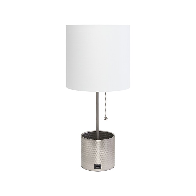 This Simple Designs fun and fashionable lamp features ahammered metal base and a white fabric shade. The lamp comes equipped with a USB port seated in the base to charge mobile phones, handheld games, tablets, and other small electronics. This lamp will add a fabulous flair to any room. Perfect for bedrooms, kids and teens, college dorms, nurseries, or fun offices. This table lamp will add a fabulous flair to any room. Uses a 40W equivalent medium-base Type-A bulb (not included). Dimensions: 18. 5" x 8"Dia. Features ahammered metal base and a white fabric shade. Comes with a 5' clear cord. Base includes storage for supplies. Features a USB port on the base for charging your phone or other devices. Perfect for bedrooms, kids' room, college dorm, nursery, or fun office. Meets or exceeds the ETL standard. 1-year manufacturer limited warranty.