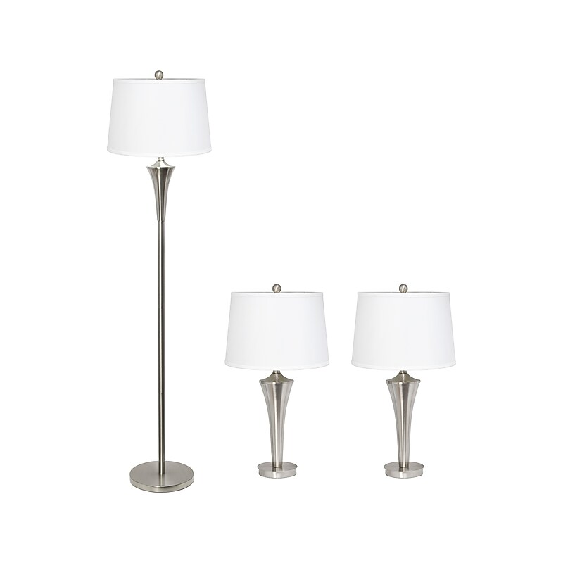 Upgrade your home with this Lalia Home Perennial beautiful three-piece matching table and floor lamp set. A tapered pole in a flawlessfinish is paired with a lovely white fabric shade to bring you a sophisticated decor style while satisfying your lighting needs. Perfect for modern, traditional, and contemporary spaces. Upgrade your home with this beautiful three-piece matching table and floor lamp set. Each lamp requires a 100W equivalent A19 medium-base bulb (not included). Floor lamp dimensions: 62"H x 16"Dia. ; table lamp dimensions: 27. 25"H x 15"Dia. Metal bases in afinish. Tapered crisp white fabric shades for a clean, fresh look. Floor lamp comes with a 9. 5' clear cord, while the table lamps come with a 6. 5' clear cord each. Each lamp features a rotary switch on the socket. Set includes one floor lamp and two table lamps. Lamp shades are secured using harps and finials in a matching finish. Meets or exceeds the UL standard. 1-year manufacturer limited warranty.