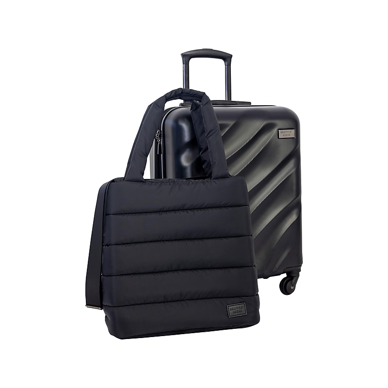 This is a fabulous Geoffrey Beene two-piece luggage set consisting of a 20" hardside expandable vertical suitcaswe and a 15" puffy quilted carry-all. The hardside vertical is made of rugged ABS plastic and has a fully lined interior. The case features 360-degree spinner wheels and has a push-button telescopic handle system. The carry-all is made of puffy quilted polyester and features an adjustable/removable shoulder strap and padded handle. This is a must-have travel set. Rugged ABS plastic vertical suitcase and polyester carry-all tote Hardside luggage features a push-button telescopic handle, 360-degree spinner wheels, and a fully lined interior. Suitcase dimensions: 21. 5"H x 15"W x 9"D. Vertical suitcase also expands for added packing capacity and has adjustable compression straps to hold contents in place. Softside tote has thick padded carry handles and can slide over your hardside carry-on luggage; the bag also has an adjustable/removable shoulder strap and a zippered interior pocket. Set consists of: 20" hardside expandable vertical suitcase and 15" puffy quilted carry-all. Suitcase weight: 7. 5 lbs. 2-year manufacturer limited warranty.