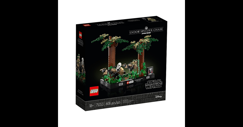 Capture the dynamism of a thrilling Star Wars: Return of the Jedi scene with the LEGO Star Wars Endor Speeder Chase Diorama building set. It features three LEGO minifigures (Princess Leia, Luke Skywalker, and a Scout Trooper), two speeder bikes with transparent elements, so you can pose them at angles as if flying through the forests of Endor, two buildable trees, and fern elements. Complete this build-and-display model with a plaque featuring Luke Skywalker's words ("Quick! Jam their comlinks. Center switch!") and a plaque with the Star Wars: Return of the Jedi 40th anniversary logo. This is part of a collection of LEGO Star Wars Sets for adults, including other buildable dioramas depicting memorable scenes, and it makes a super gift for yourself and other adult Star Wars fans. The LEGO Builder app offers a convenient way to store your building instructions and keep track of your progress, with tools to zoom in and rotate models in 3D. Build a dynamic snapshot of Princess Leia and Luke Skywalker's pursuit of a Scout Trooper from Star Wars: Return of the Jedi with this building set. Collectible set for adults is designed for people who enjoy fun DIY projects to relax in a mindful and creative way. This set is part of a collectible series of build-to-display diorama models, each depicting a memorable Star Wars moment. Consists of 608 pieces. This set includes three minifigures: Princess Leia and Luke Skywalker in Endor outfits, and a Scout Trooper; Luke has a green lightsaber while Leia and the Scout Trooper each have a blaster. Two speeder bikes (one for Leia and Luke and one for the Scout Trooper) with transparent elements to pose them at dynamic angles, two buildable trees, fern elements, and more. Diorama features a plaque marking the 40th anniversary of Star Wars: Return of the Jedi. Measuring over 8"H x 11"W x 7"D. Treat yourself or give this set as a holiday gift or birthday present to a friend with a passion for Star Wars or a collector of Star Wars dioramas. LEGO Builder app keeps your building instructions organized and at hand with tools that let you zoom in and rotate models in 3D, save sets, and track your progress. Components comply with stringent industry standards to ensure they connect simply and securely for robust builds. Components are dropped, heated, crushed, twisted, and analyzed to make sure they comply with demanding global safety standards.