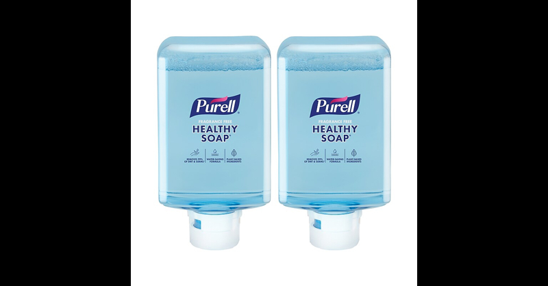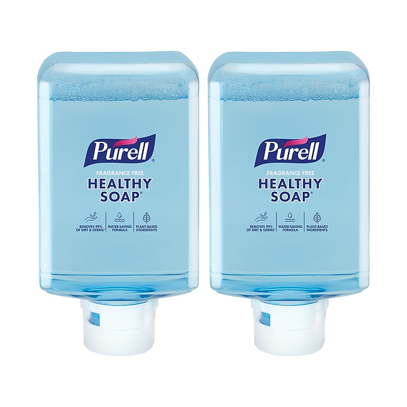PURELL HEALTHY SOAP with CLEAN RELEASE Technology Fragrance Free Foam is unique. It cleans better than regular soap without harsh preservatives and antibacterials that can cause skin irritation. The patented PURELL formula reaches into skin's cracks and crevices 2X better than regular soap to lift away more than 99% of dirt and germs. You can see the difference when you wash, as it rinses quickly and cleanly, saving time and water. This a sustainable soap, made with plant-based ingredients and 50% renewable energy. This mL refill bottle is made with recyclable plastic components. The collar and alkaline AA battery easily pull apart making it easy to recycle and reduce product waste. Thoughtfully designed for people and the planet, PURELL HEALTHY SOAP with CLEAN RELEASE Technology Fragrance Free Foam cleans better than regular soap without irritating ingredients. CLEAN RELEASE Technology boosts soap performance by reaching into skin's cracks and crevices 2X better than regular soap to lift and wash away more than 99% of dirt and germs. Naturally cares for your skin. Made with plant-based ingredients. Free of antibacterials, harsh preservatives, fragrance, dyes, phthalates, and parabens to pamper even irritation-prone hands. Rinses quickly and cleanly, saving water with every wash. In fact, each refill saves an estimated 6 gallons of water compared to regular soap. Case Includes: 2 PURELL HEALTHY SOAP with CLEAN RELEASE Technology Fragrance Free Foam mL Refills for ES10 Automatic Soap Dispenser (sold separately; SKUs 8334-E1, 8330-E1, 8338-E1). A certified Women-Owned Business manufactures this product. Safety Data Sheet . PURELL HEALTHY SOAP with CLEAN RELEASE Technology Fragrance Free Foam cleans better than regular soap without irritating ingredients.