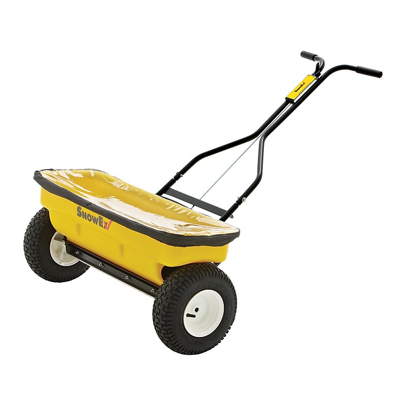 The SnowEx walk-behind drop spreader is perfect for melting ice in confined areas such as sidewalks and walking paths. Offering a 160 lbs. capacity, this unit spreads in a 28" wide path, making it perfect for applying bagged rock salt or pelletized material to sidewalks, driveways, and other tight applications. Walk-behind drop spreader is great for melting ice in confined areas such as sidewalks and walking paths. Comes in brightwith black accents. Overall spreader dimensions: 36"H x 38. 25"W x 48"D; hopper dimensions: 30" x 13"; weight is 55 lbs. Delivers a consistent flow of material directly to the ground, reducing waste and preventing material from flinging into unwanted locations. Standard poly cover protects from the weather elements and keeps foreign objects out of the hopper. Clear cover allows the operator to easily look inside and constantly monitor material levels. Standard top screen prevents large chunks of material from entering the hopper. Large, pneumatic tires enhance maneuverability over ice and snow. Material compatibility: bagged rock salt, calcium chloride pellets, bagged ice melters. Viscous or tacky substances or those containing solid particles are not recommended as they will clog pumps and nozzles. Spreading width: 28". Capacity: 160 lbs.